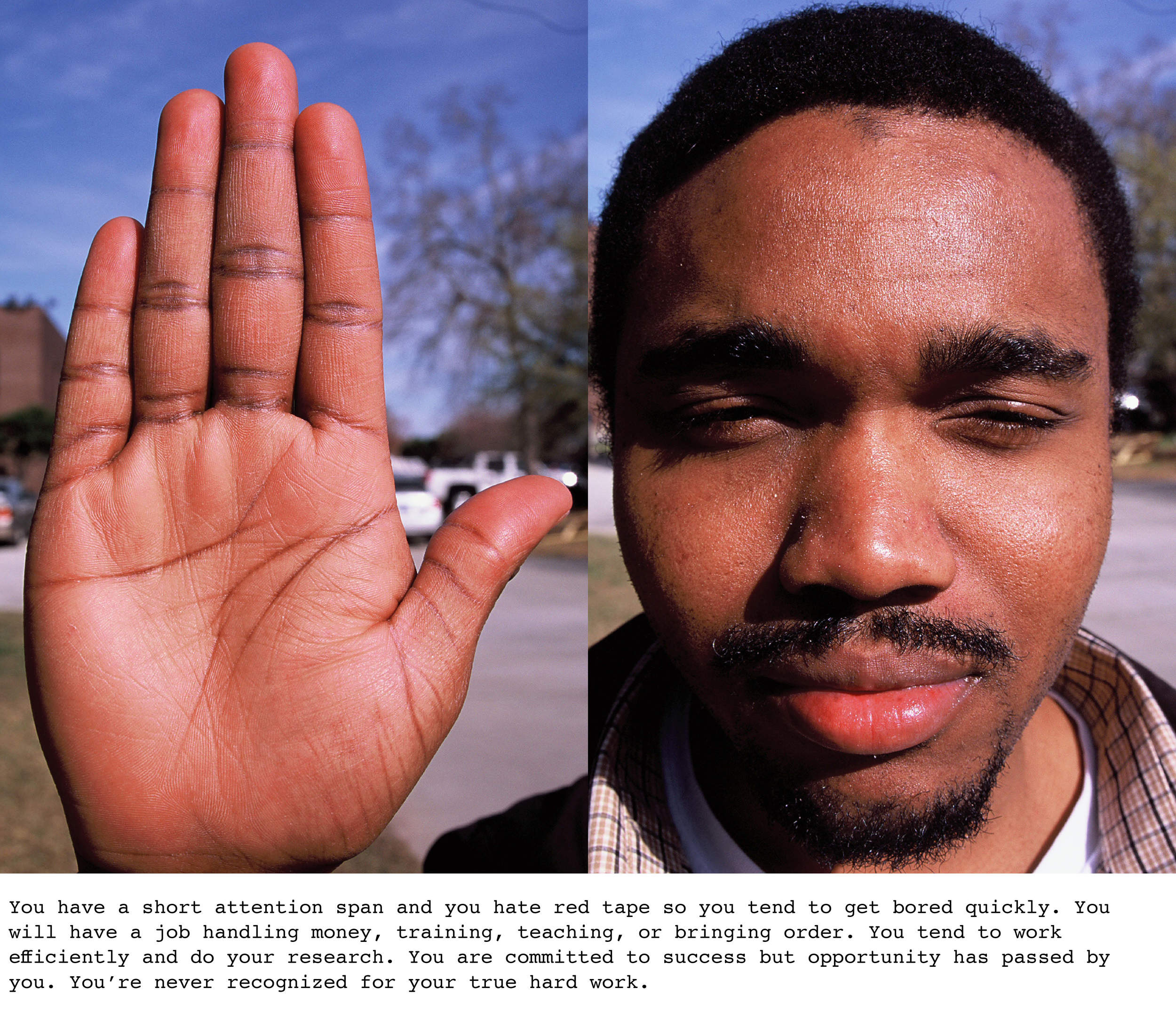 ‘…with right hand to god and eyes to man.’ I created this series of hand and face portraits to emulate the symbolic gesture of telling the truth before God. Many are convinced that the eyes are the windows of the soul. I believe the hands are the true windows to the soul. I ask the subject to face their palms toward the camera to gather information about their life expectancy, health, wealth and love. I consulted a New Orleanian clairvoyant to document the subject’s character and nature. People I Know’ is a series of self-actualization and honesty. My goal is to translate the vernacular of the subconscious that is seldom seen and heard in one’s public life.